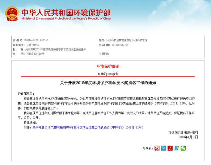 河北誠譽環境工程有限公司獲悉,2018年度環境保護科學技術獎項目征集工作正式啟動,網上申報截止日期為2018年5月31日17:00,書面材料報送截止日期為2018年6月15日(以郵寄日期為準)詳情如下: ..